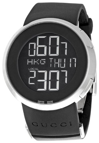With its mix of black and silver tones, bold design, and precise craftsmanship, the Gucci Women's I-Gucci Digital Black Watch YA114401 is a luxurious piece you'll love to show off. A generously sized, silver-tone stainless steel case surrounds a sleek digital dial, complete with easy-to-read time display. For flexible comfort, a black rubber strap closes easily with a deployment push-button clasp with buckle, while both a scratch-resistant sapphire and water resistance to 99 feet, 30 meters provide an extra measure of protection against wear and tear. As reliable as it is stunning, this Gucci original boasts the accuracy of Swiss quartz movement.